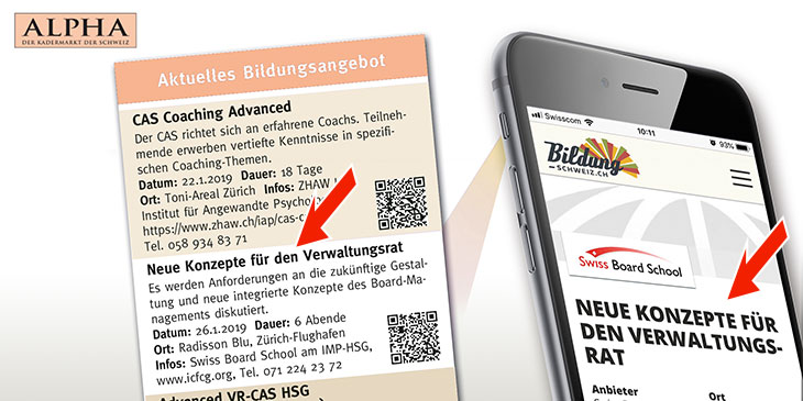 Mit ALPHA, dem umfangreichsten Kader- und Spezialistenmarkt der Schweiz, sprechen Sie Ihr Zielpublikum für Top-Bildung direkt an. Ihr Event erscheint gedruckt im Tages-Anzeiger und in der SonntagsZeitung als Bildungs-Agenda und auf den Webseiten von Bildung-Schweiz.ch.ch und dessen Online-Netzwerk.