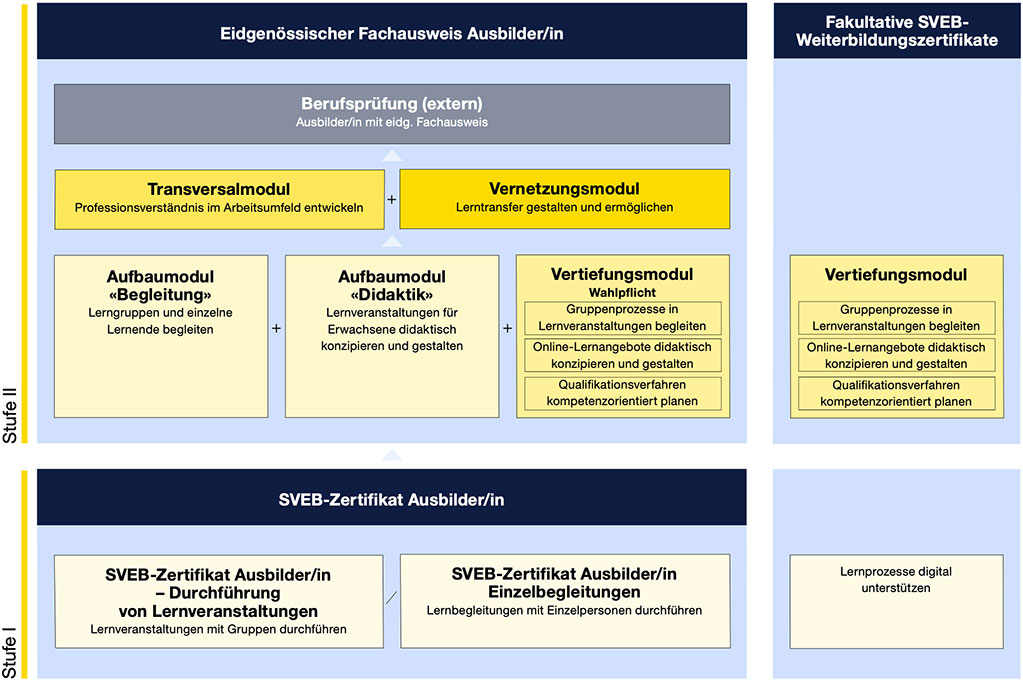 Wie das bisherige Baukastensystem ist auch der revidierte AdA-Baukasten dreistufig und modular aufgebaut. An der EB Zürich können Module der Stufen I und II besucht werden.