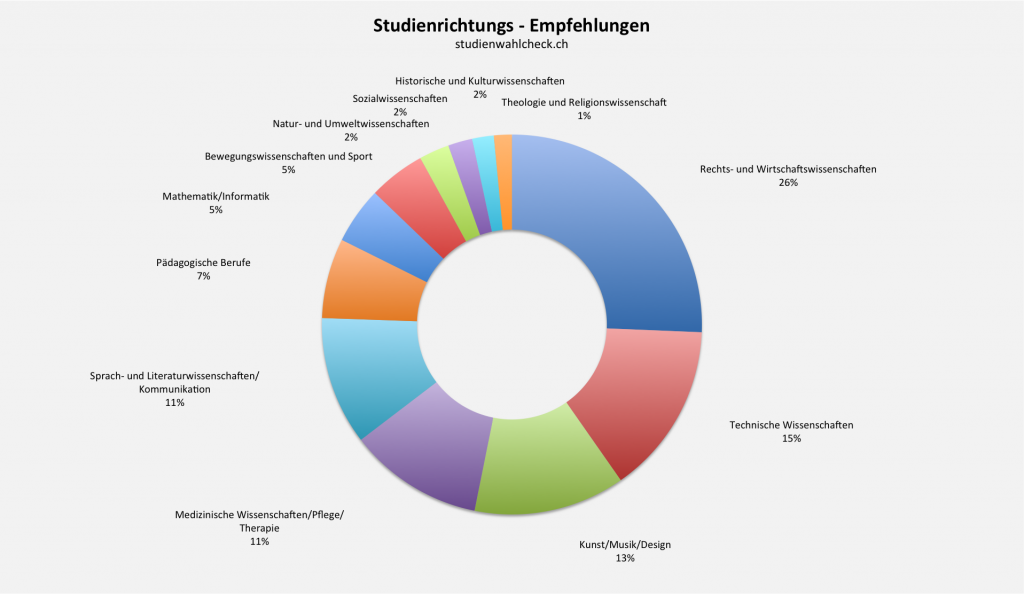 Roger ist 25, hat zwar (noch) kein Masterstudium in der Tasche, aber vier Jahre Ausbildung – und darf sich jetzt mit einem Bachelor in Betriebsökonomie (Vertiefung Banking & Finance) schmücken. Daneben 60 Prozent arbeitend, hat der Thurgauer sehr viel Zeit und Energie in seine Weiterbildung gesteckt. Ob ihm auch der Studienwahlcheck auf die Sprünge geholfen hat? Der 2013 konzipierte Test sieht sich als Hilfe bei der Entscheidungsfindung für angehende Studierende. Über 34’000 Benutzer und Resultate plus eine Weiterempfehlung von über 90 Prozent deuten darauf hin, dass der Test eine echte Hilfe ist. Wer sich maximal 20 Minuten Zeit nimmt, bekommt mit der Auswertung drei Vorschläge, welche die Top-3-Studienrichtungen anzeigen. Die nachfolgende Grafik zeigt die Favoriten der angehenden Studierenden.