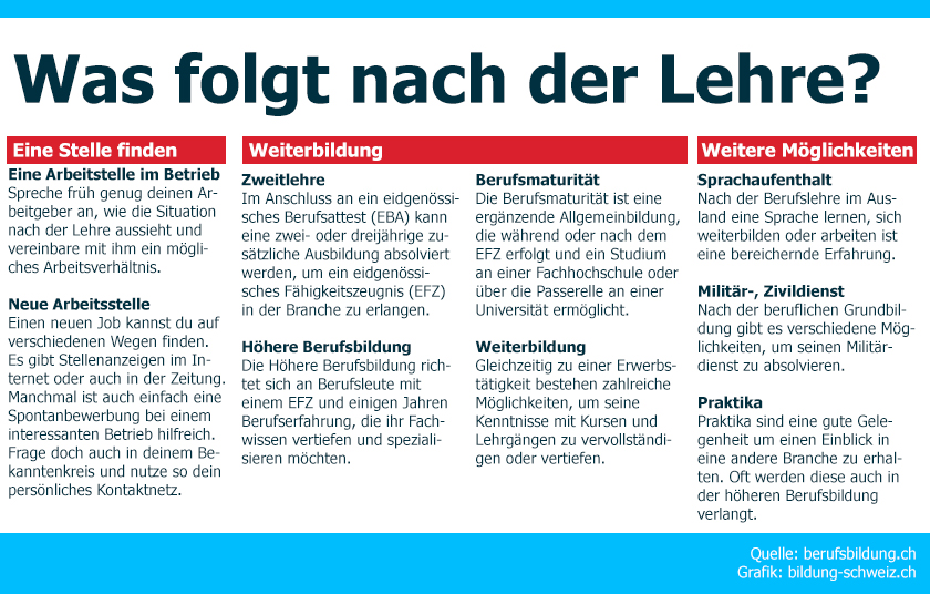 Ob Sprachaufenthalt, Weiterbeschäftigung im Betrieb, Weiterbildung respektive Zweitbildung oder Militärdienst – zahlreiche Optionen bieten sich dir nach erfolgreichem Abschluss der Lehre. Wichtig ist, dass du für dich einen eigenen Fahrplan entwirfst. Frühzeitiges Abklären und Planen hilft dir, dich während den Abschlussprüfungen aufs Wesentliche zu konzentrieren. Wir haben die bekanntesten Möglichkeiten aufgelistet.